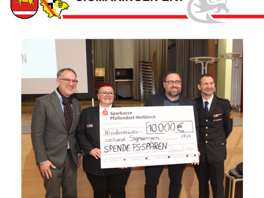 Am Freitag, 20. Februar 2026, fand die Verbandsversammlung des Kreisfeuerwehrverband Sigmaringen e.V. in Kreenheinstetten statt. Mehr als 300 Angehörige, Freunde und Unterstützer der Blaulichtfamilie waren der Einladung gefolgt. Den Auftakt der Veranstaltung bildete ein gemeinsames Vesper, das musikalisch vom Musikverein Kreenheinstetten umrahmt wurde. Anschließend begrüßte die Vorsitzende Daniela Stroppel die zahlreichen Gäste und Delegierten. Ein Grußwort sowie eine Vorstellung der Gemeinde Leibertingen folgte durch den Bürgermeister Stephan Frickinger. Im Anschluss stellte die Vorsitzende die Beschlussfähigkeit fest: Von insgesamt 154 Delegierten waren 145 anwesend. In einer würdevollen Totenehrung gedachte Edwin Müller der verstorbenen Kameradinnen und Kameraden. Im Dialog zwischen dem Kreisbrandmeister Michael Reitter und der Vorsitzenden Daniela Stroppel wurde anschließend auf das vergangene Jahr zurückgeblickt. Thematisiert wurden neben zahlreichen Themen, unter anderem die Einsatzzahlen, Veranstaltungen, die Personalstatistik sowie die Durchführung von Gruppenführerschulungen. Zudem wurde über die Umstellung der Einsatzstichworte berichtet. Auch ein Ausblick auf das kommende Jahr stand auf der Agenda. Dazu zählen unter anderem die Erstellung von Checklisten für Verbandsveranstaltungen, die anstehende Novellierung des Feuerwehrgesetzes, Aspekte des Krisenmanagements, ein neues Leistungsabzeichen ab dem Jahr 2027 sowie mögliche Anpassungen der Ausrückeordnung. Der Kassenbericht von Claudia Koch-Steinert wurde von Christian Zielke verlesen. Trotz vieler Aktivitäten konnte eine sehr positive Bilanz präsentiert werden, insbesondere durch zahlreiche Einsparmaßnahmen. Die Kassenprüfung wurde durch Karl-Heinz Dumbeck und Karl Riffenach durchgeführt. Im Rahmen der Entlastung der Vorstandschaft richtete Landrätin Stephanie Bürkle ihr Grußwort aus. Sie dankte allen ehrenamtlich Engagierten für ihren Einsatz und lobte insbesondere die Arbeit der Vorsitzenden Daniela Stroppel in ihrem ersten Amtsjahr. Der Haushaltsplan für das Jahr 2026 wurde ebenfalls von Claudia Koch-Steinert erstellt und durch Christian Zielke vorgestellt. Ein besonderer Programmpunkt war der Vortrag von Wolfgang Schneiderhan. Unter dem Titel „Unser Land, unsere Gesellschaft im Stresstest in einer Welt aus den Fugen“ sprach der General außer Dienst über aktuelle sicherheitspolitische Herausforderungen und gesellschaftliche Entwicklungen. Im weiteren Verlauf der Versammlung wurden zahlreiche Feuerwehrangehörige für ihr herausragendes Engagement geehrt. Zudem fand eine Verabschiedung, sowie Ernennungen von Fachgebietsleitern, Kreisausbildern und Mitgliedern im Führungsstab statt. Nach den Grußworten des Vizepräsidenten des Landesfeuerwehrverbandes Baden-Württemberg Klaus Merz, MdL Klaus Burger und dem ersten Polizeihauptkommissar Uwe Kärcher wurde dem Verband unter dem Tagesordnungspunkt „Wünsche und Anträge“ eine Spende in Höhe von 10.000 Euro überreicht. Diese übergaben der Vorstandsvorsitzende Dr. Jörg Scheibe sowie Regionaldirektor Manfred Kohl der Sparkasse Pfullendorf-Meßkirch zur freien Verfügung des Kreisfeuerwehrverbandes. Die Verbandsversammlung zeigte einmal mehr den starken Zusammenhalt innerhalb der Feuerwehren im Landkreis sowie die große Wertschätzung für das ehrenamtliche Engagement der Einsatzkräfte der ganzen Blaulichtfamilie.
